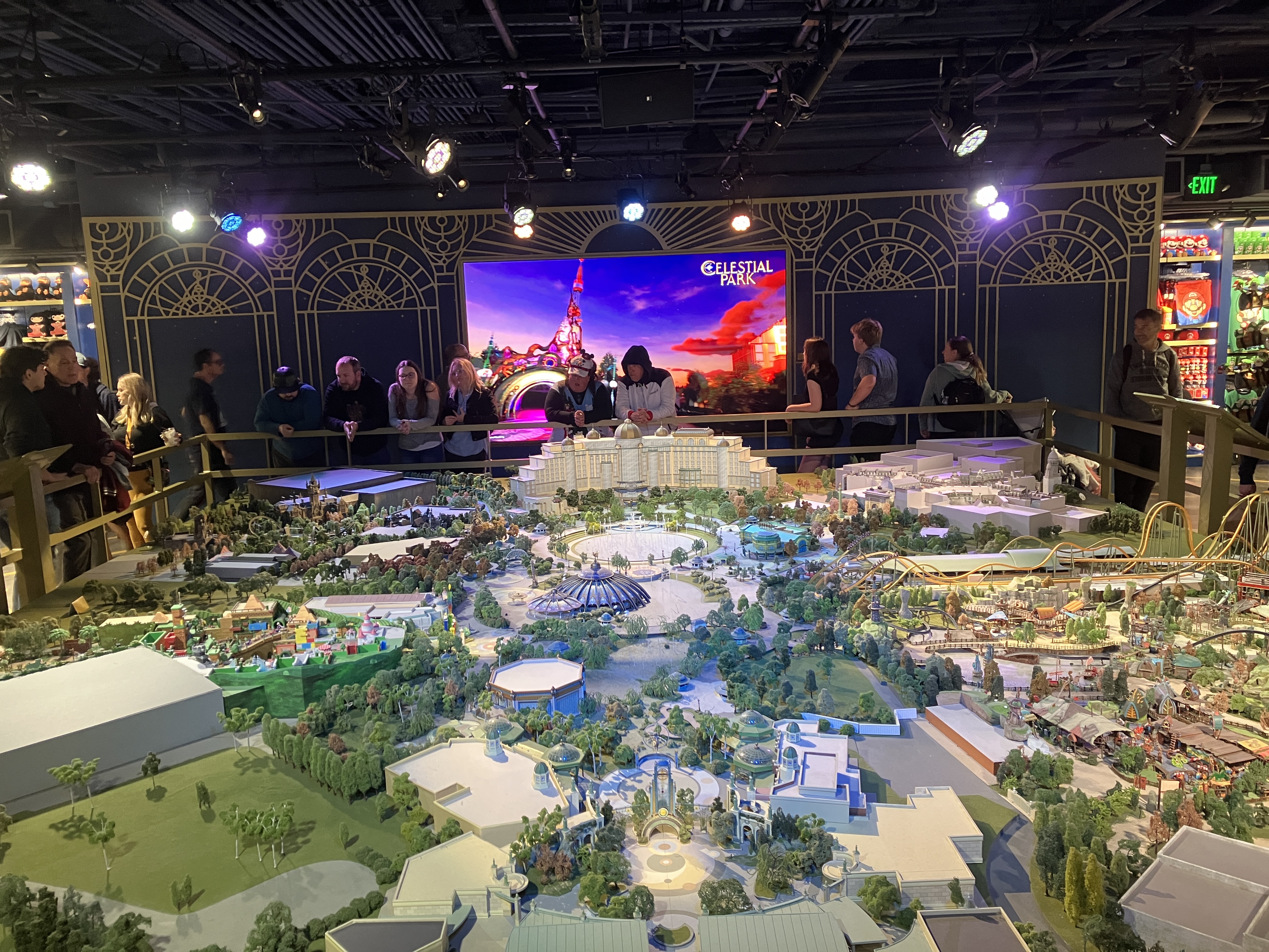 The preview center has display areas for new Epic Universe merchandise aligned with each of the five “worlds” that will make up the park. If you haven’t been keeping up with the construction of the latest Universal Orlando expansion, it will be built around a center hub with intricately themed archways, or “portals,” ushering guests into five different worlds: Celestial Park, Dark Universe, How to Train Your Dragon – Isle of Berk, Super Nintendo World, and of course the Wizarding World of Harry Potter – Ministry of Magic. Images representing the portal entrances to these worlds surround the interior walls of the preview center, but of course, the main attraction is the enormous scale diorama of the park in the center of the room that guests can walk around.