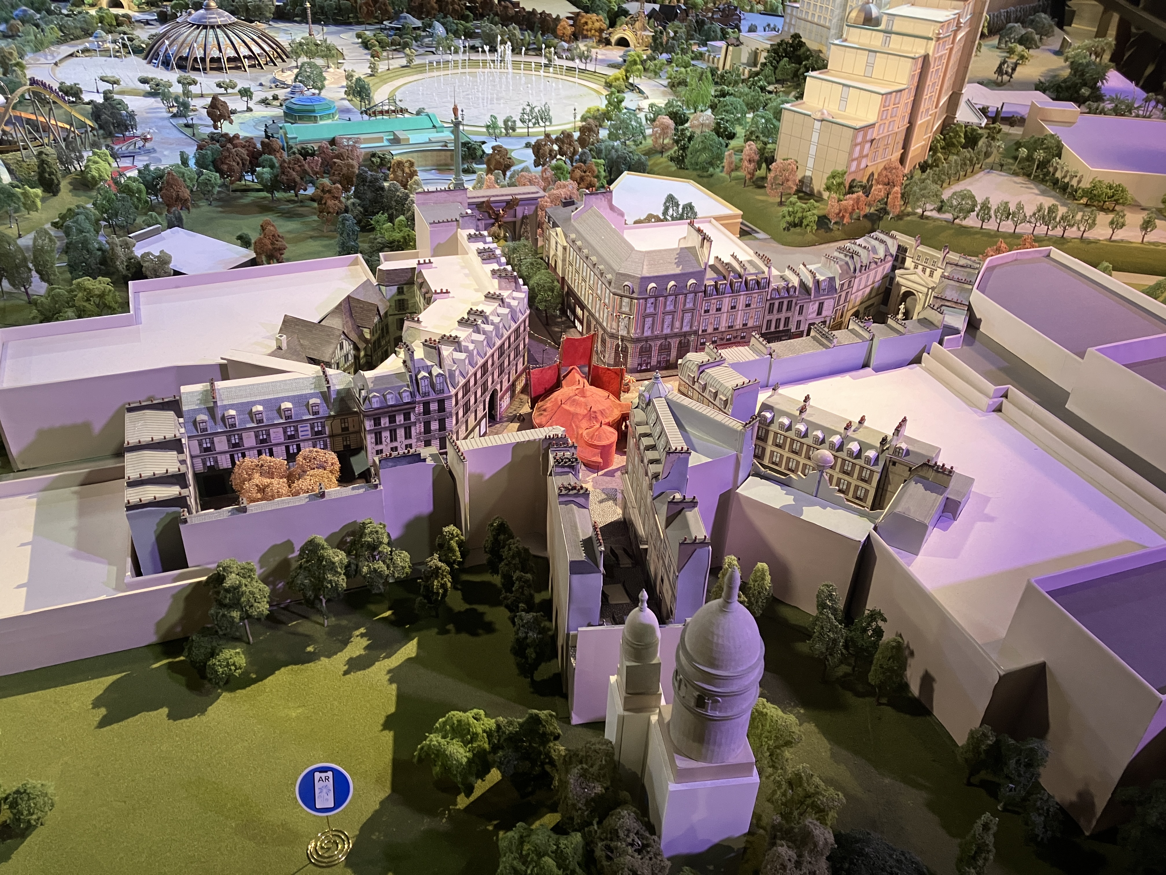 In the Wizarding World of Harry Potter – Ministry of Magic, you can clearly make out the tent for the Circus Arcanus show, inspired by the magical circus seen in Fantastic Beasts: The Crimes of Grindelwald. You can also make out the archway to the world and the tall beacon topped with a hand holding the Elder Wand. When examining the diorama, we were struck by the sheer size of the warehouse-like buildings behind the Paris facades that are clearly housing the much-anticipated Battle at the Ministry ride.