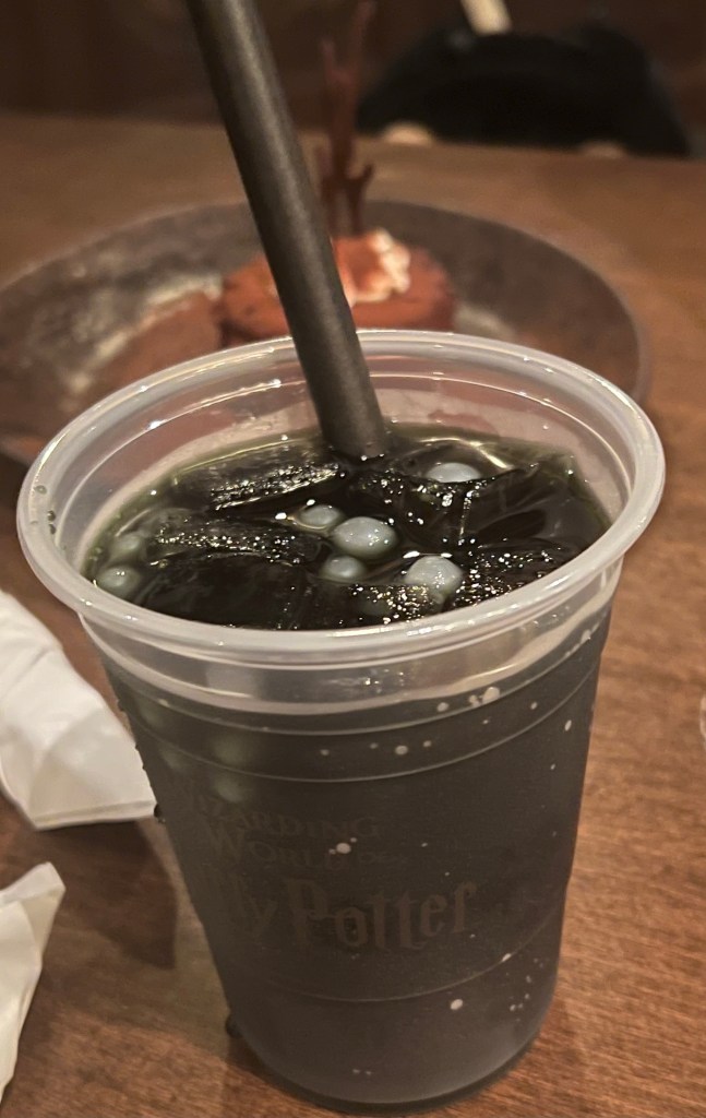 The nonalcoholic specialty drink Le Breuvage Sombre du Gobelet Noir is described on the menu as a “deliciously dark brew conjuring unique flavors of mixed fruit topped with the eyes of Plimpies (yogurt popping pearls).” It was surprisingly good and is very sweet and fruity, which is almost the opposite of what you’d expect from a drink that is so dark in color (it is almost black!). The popping yogurt pearls add a fun texture as well.