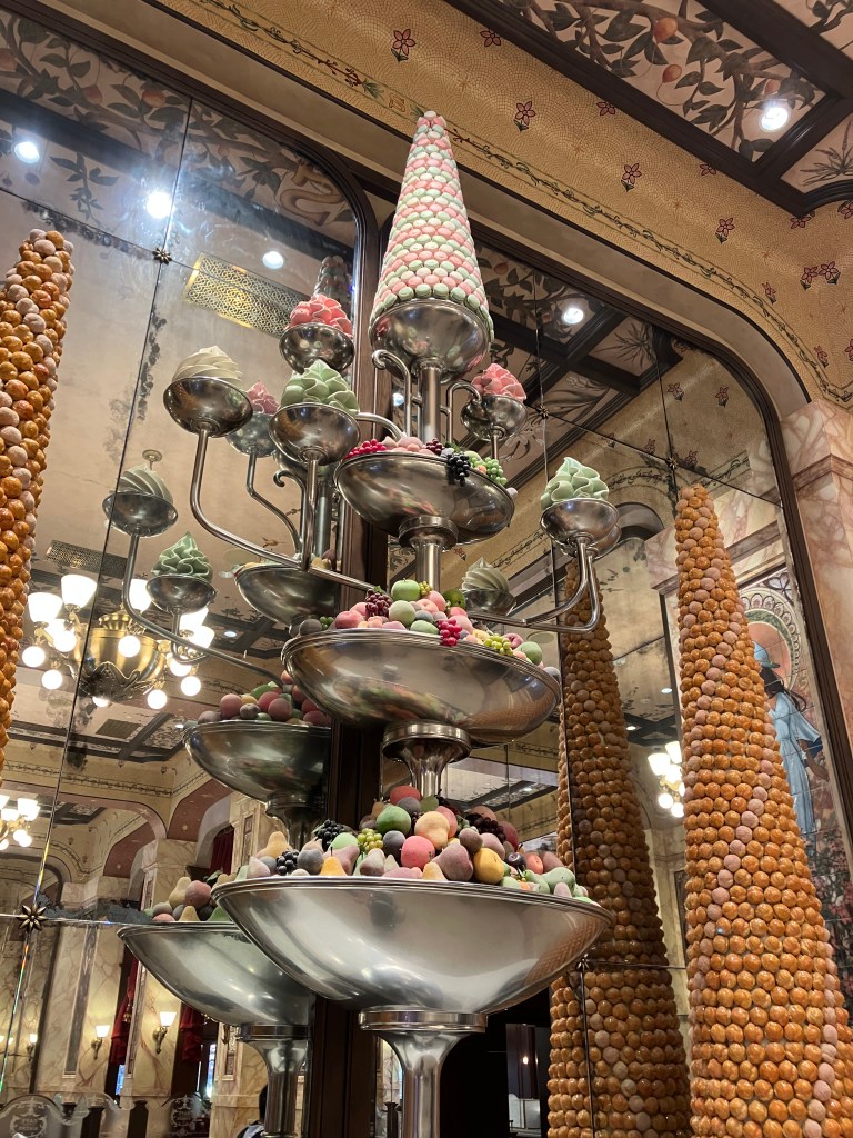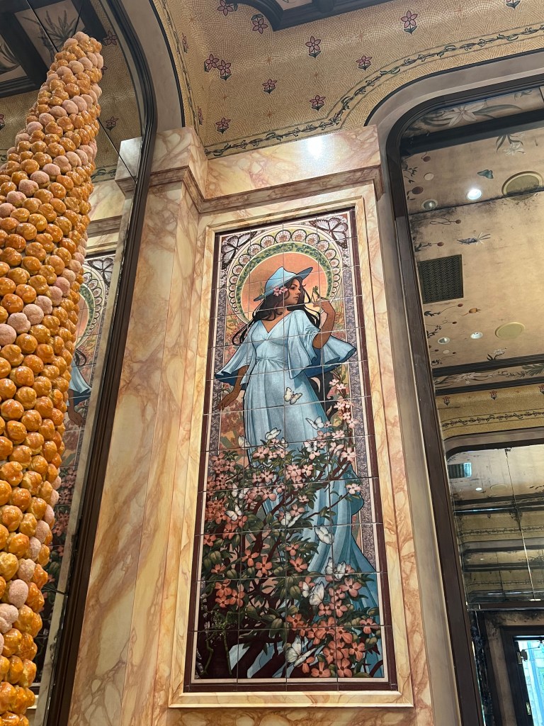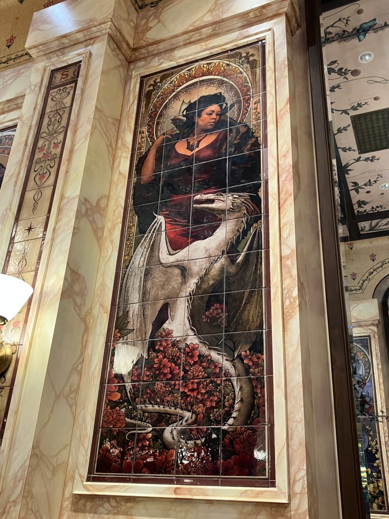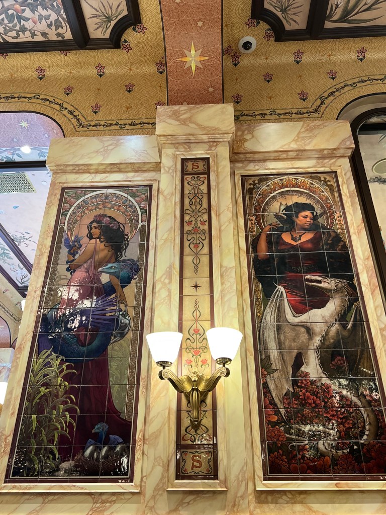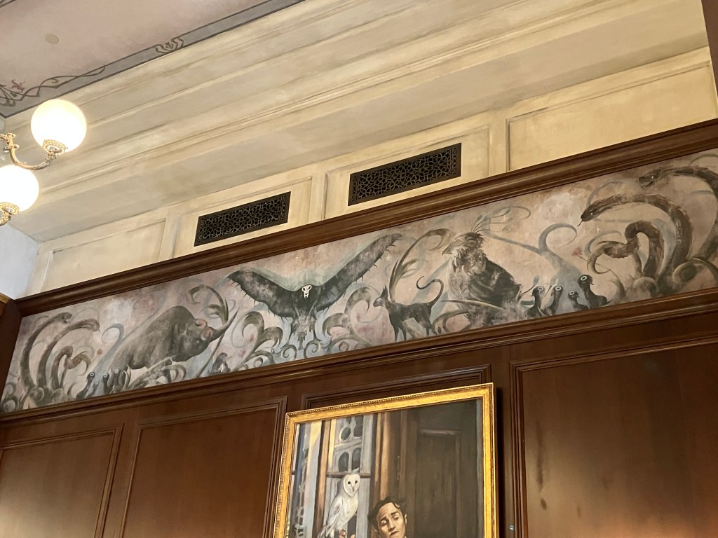 Upon entering the café, guests are greeted by an interior that’s rich in detail. Chandeliers glitter from the ceiling, and the walls are adorned with tall portraits of witches and wizards representing various wizarding communities around the world. You can spot a witch in a Baeuxbaton uniform! These portraits, as well as the wallpaper and architecture itself, feature magical creatures from the Harry Potter and Fantastic Beasts films.
